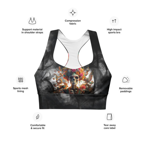 Merge active wear with lowrider culture with our Low Ride Life Longline Sports Bra. Designed for those who lead an active lifestyle but want to stay true to their cultural roots, this sports bra combines comfort, support, and style. Featuring a unique design inspired by the vibrant lowrider community, this piece is perfect for the gym, yoga, or a casual day out. Its snug fit and eye-catching pattern make it a standout piece that pays tribute to the lowrider lifestyle while keeping you secure and stylish during your activities.